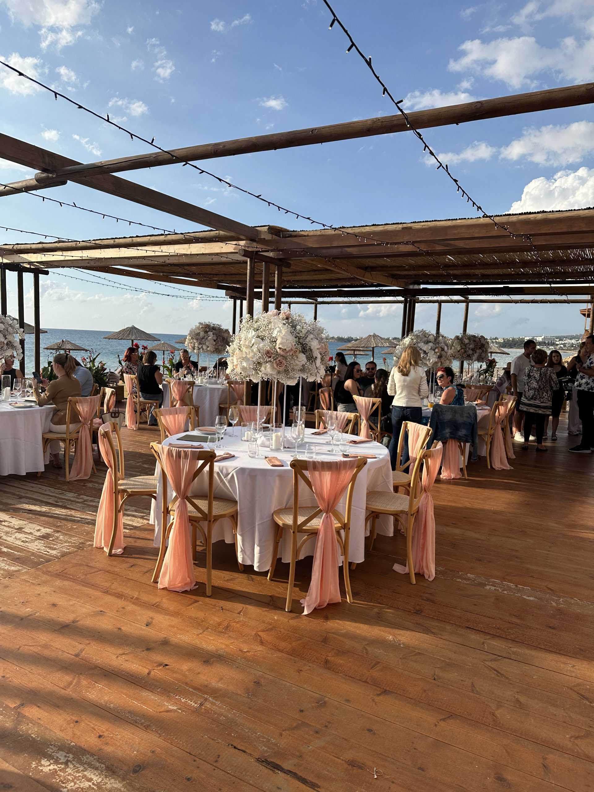 After the ceremony, you can opt for a champagne reception from a simple bar, treating your guests while they enjoy a photo session. This venue, managed by Peyia Municipality, doesn’t involve venue hire fees, making it an affordable choice for both intimate gatherings and larger celebrations. For added elegance, we can provide chiavari chairs in various colors (white, silver, gold, rose gold) along with vertical drapes in a variety of hues. Additionally, an aisle runner and a welcome sign displayed on an easel add a stylish and personalised touch to your chosen venue.