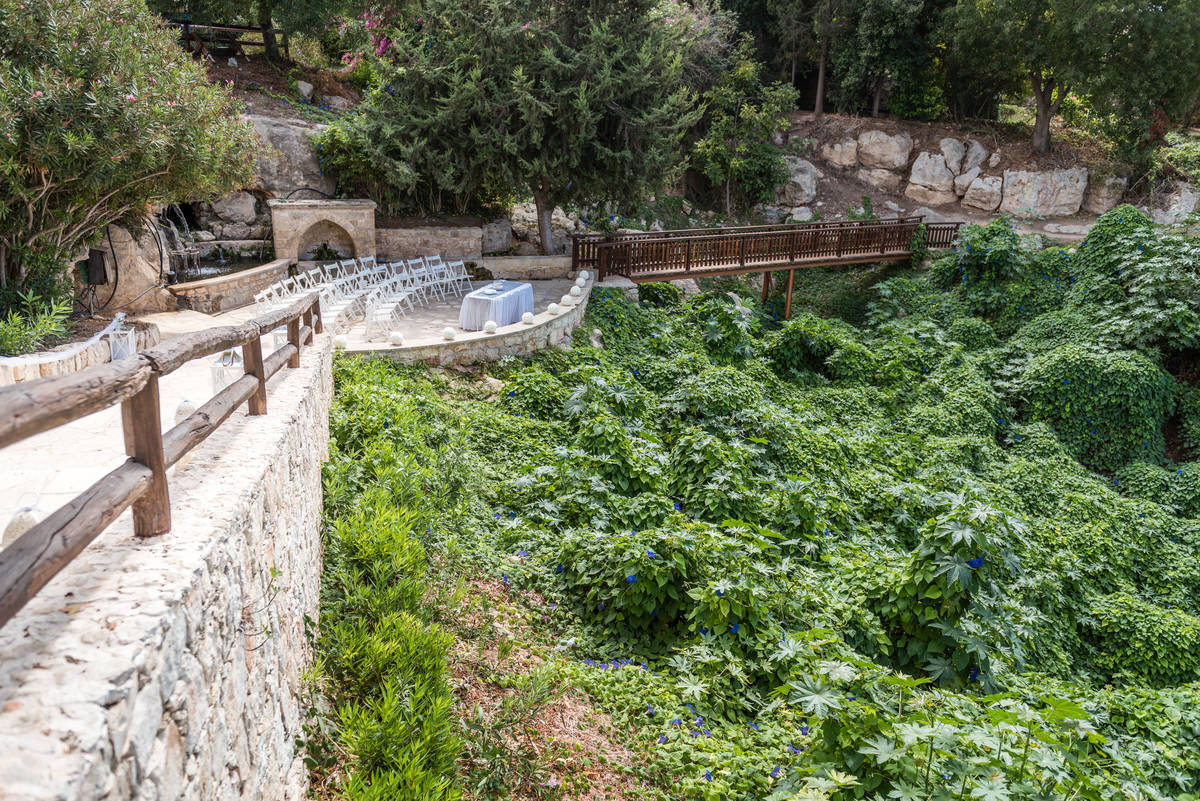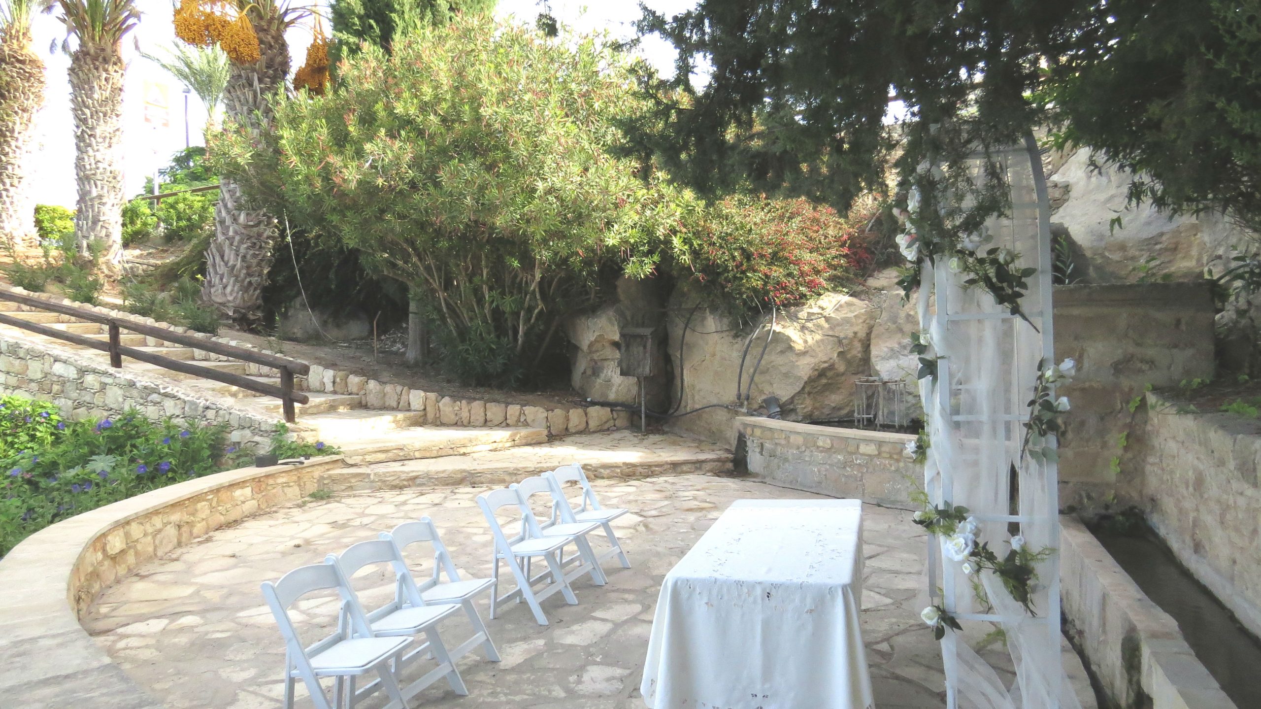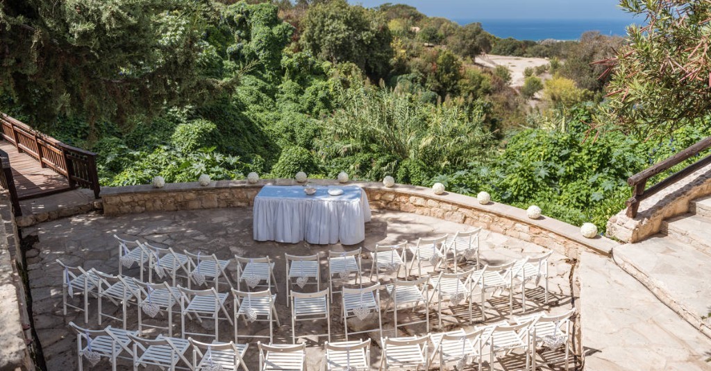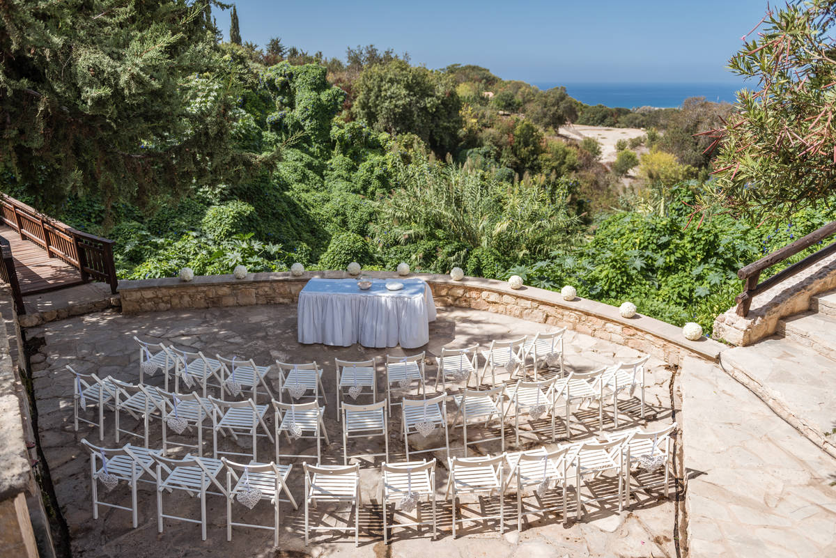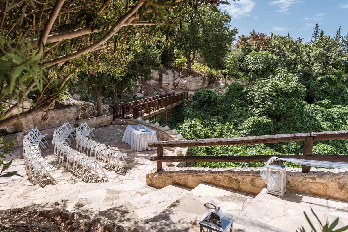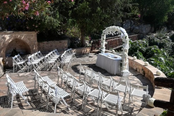 Nestled in the hills at the head of a verdant valley overlooking the sea it is surrounded by citrus and olive groves, the valley stays green and lush throughout the hot, dry summer months due to local springs, so makes for some stunning wedding photos.
