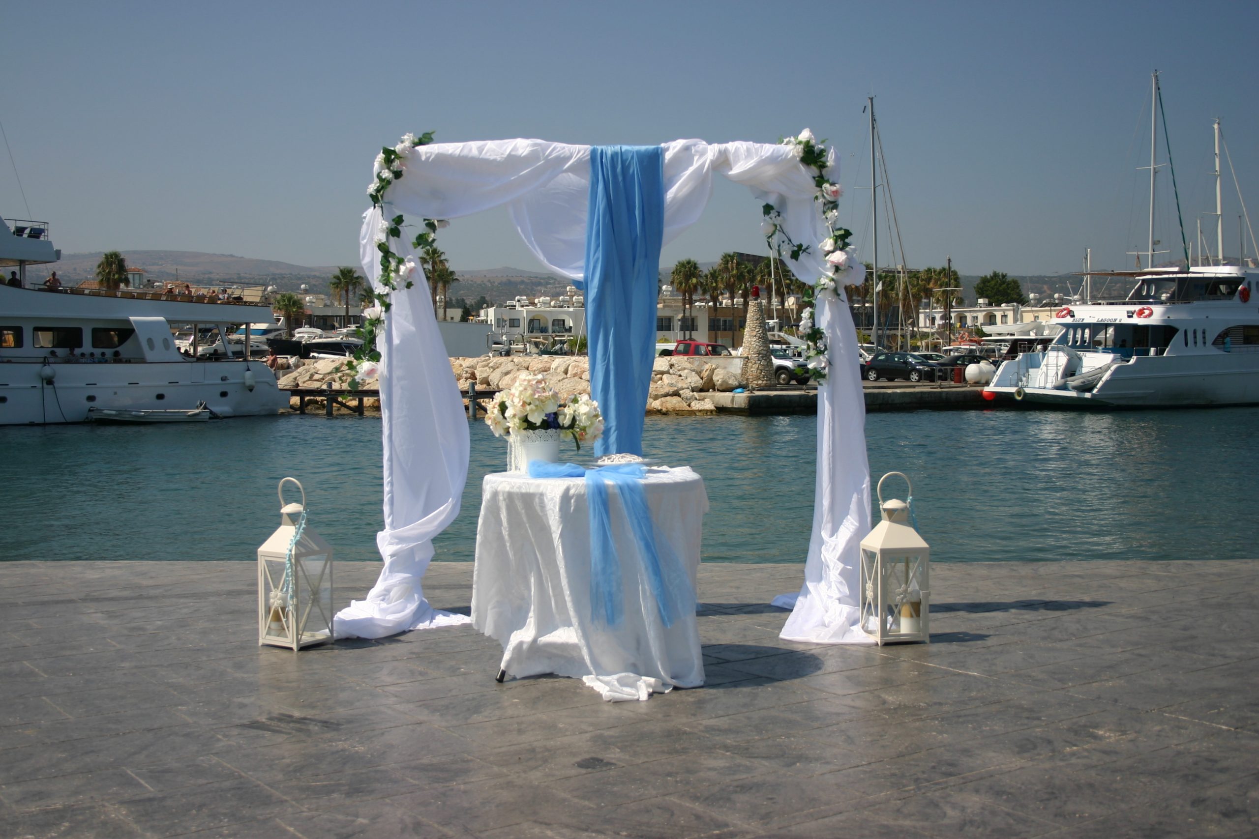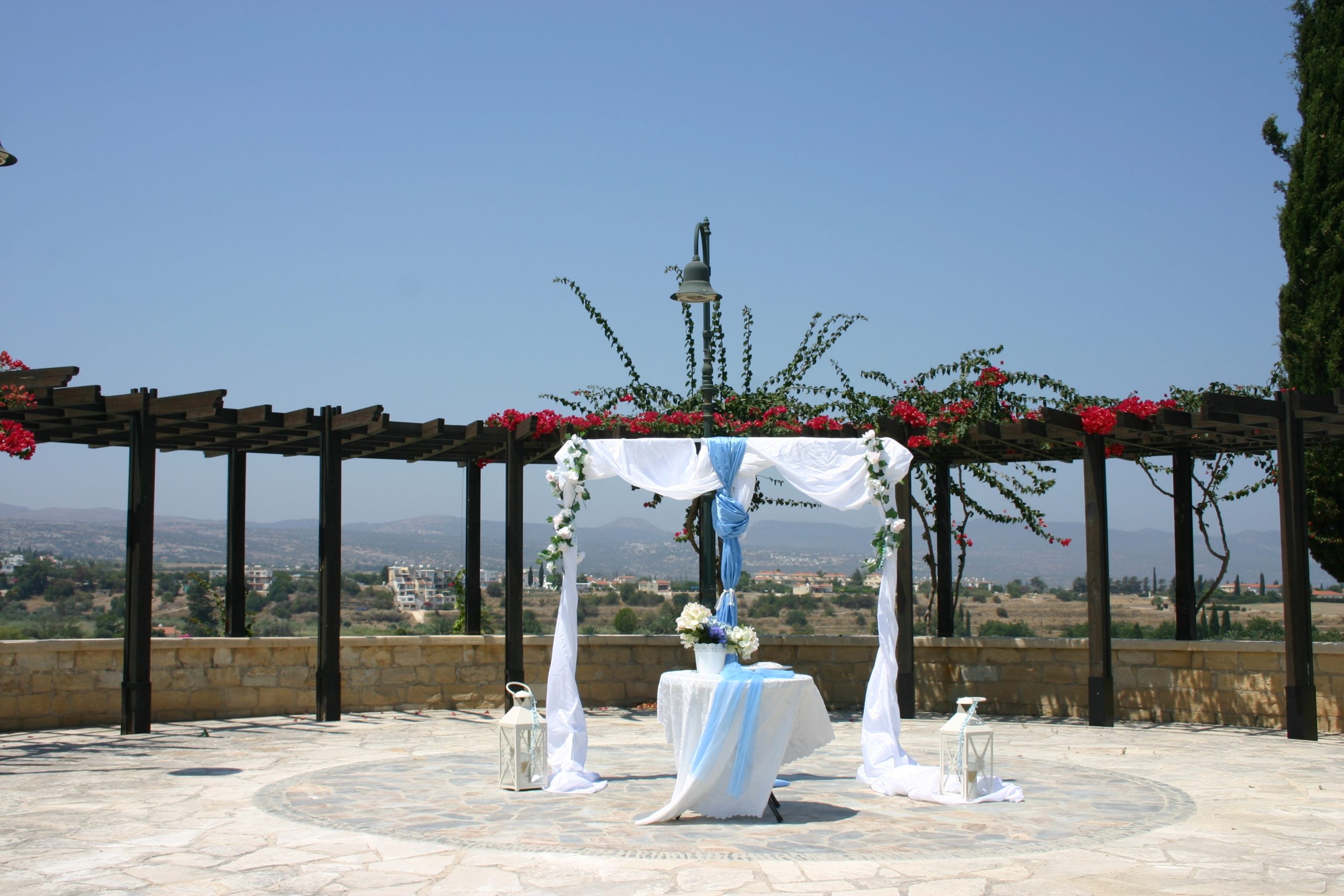 Polis Town Hall weddings take place in Ayios Andronikos Park which is right opposite the Town Hall. This is a small attractive park with a semi-circular wooden gazebo and views over the valley to the distant mountains. This is a cost effective venue for a wedding as there are no venue hire fees to pay. The Town Hall provides a simple decorated archway and white covered ceremony table or we can provide alternatives for you if you prefer. Drinks can be served here after the ceremony if you wish.