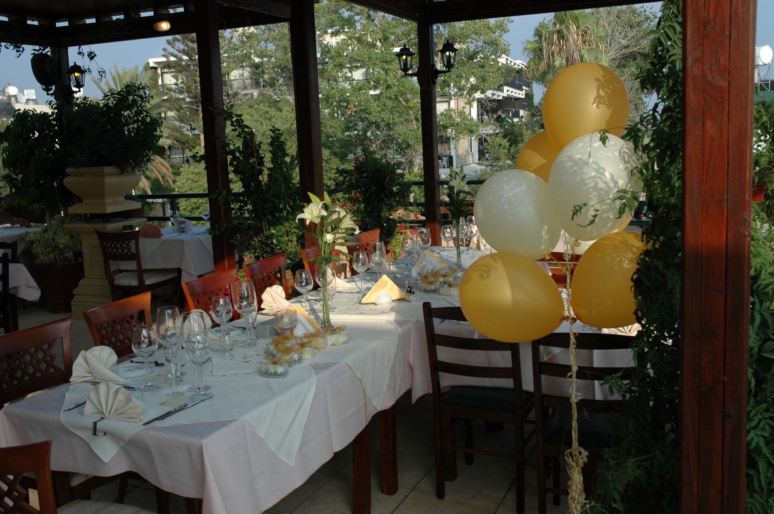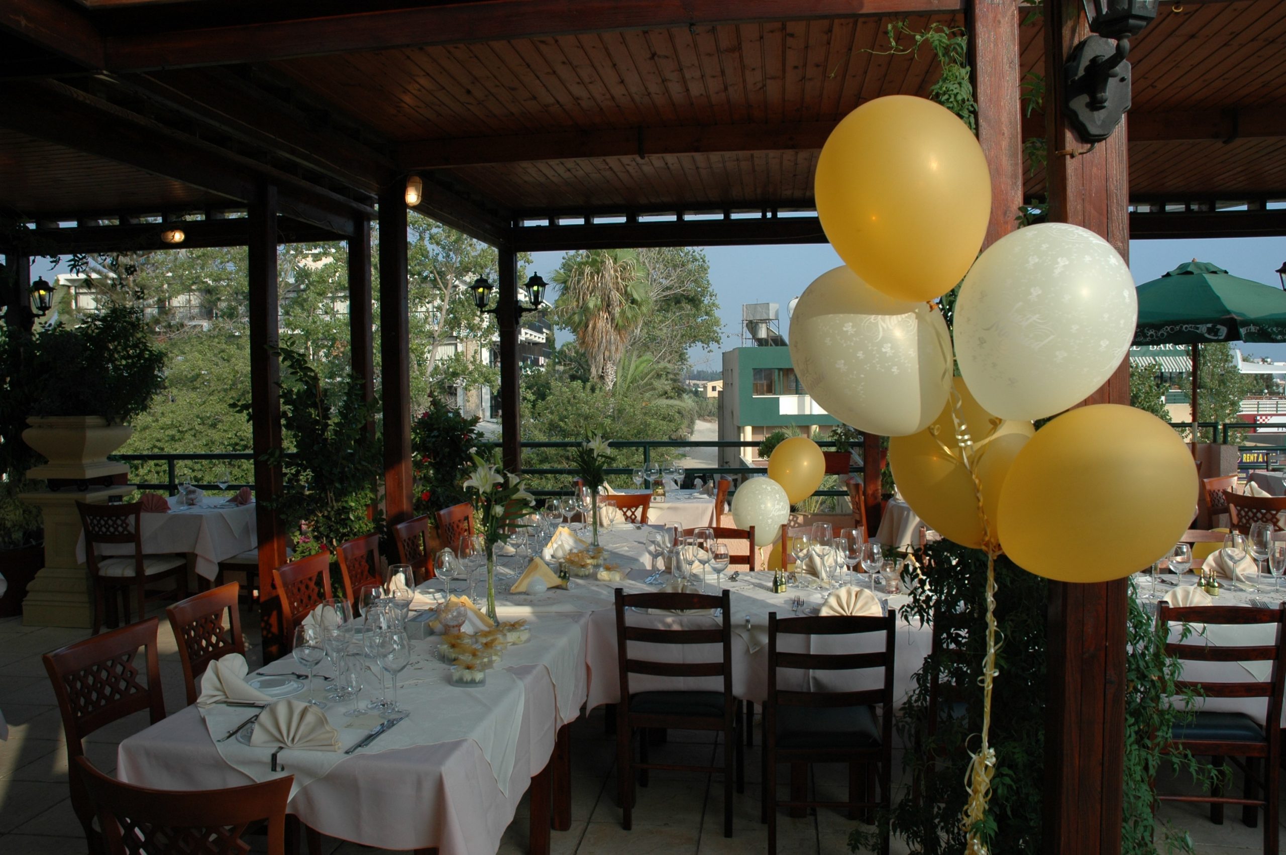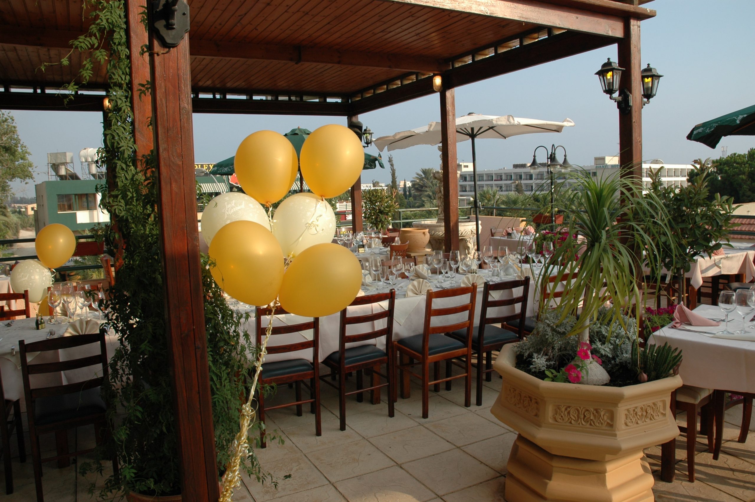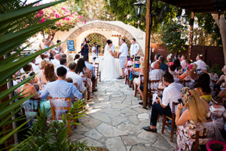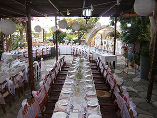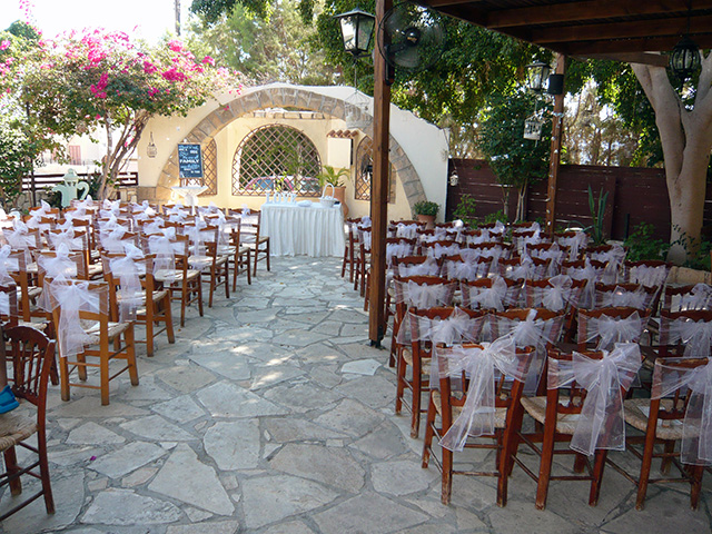 This lovely taverna is in the heart of Kato Paphos, tucked away down a side turning and it hosts many restaurant weddings every year. It has a very large stone courtyard outside with wooden gazebo covering, informal seating area with bar and lovely flowers and trees surrounding the garden. It is ideal for both small and large receptions, it has a large indoor party room for music and dancing. Both the ceremony and reception can be held at the restaurant and of course you can have a cocktail reception and dancing in the evening. The food is very good and you have a choice of traditional Meze, BBQ or 3 course set menus.