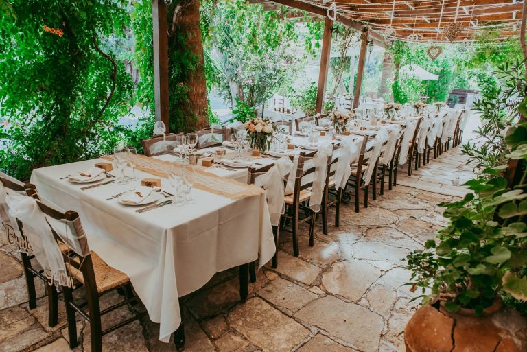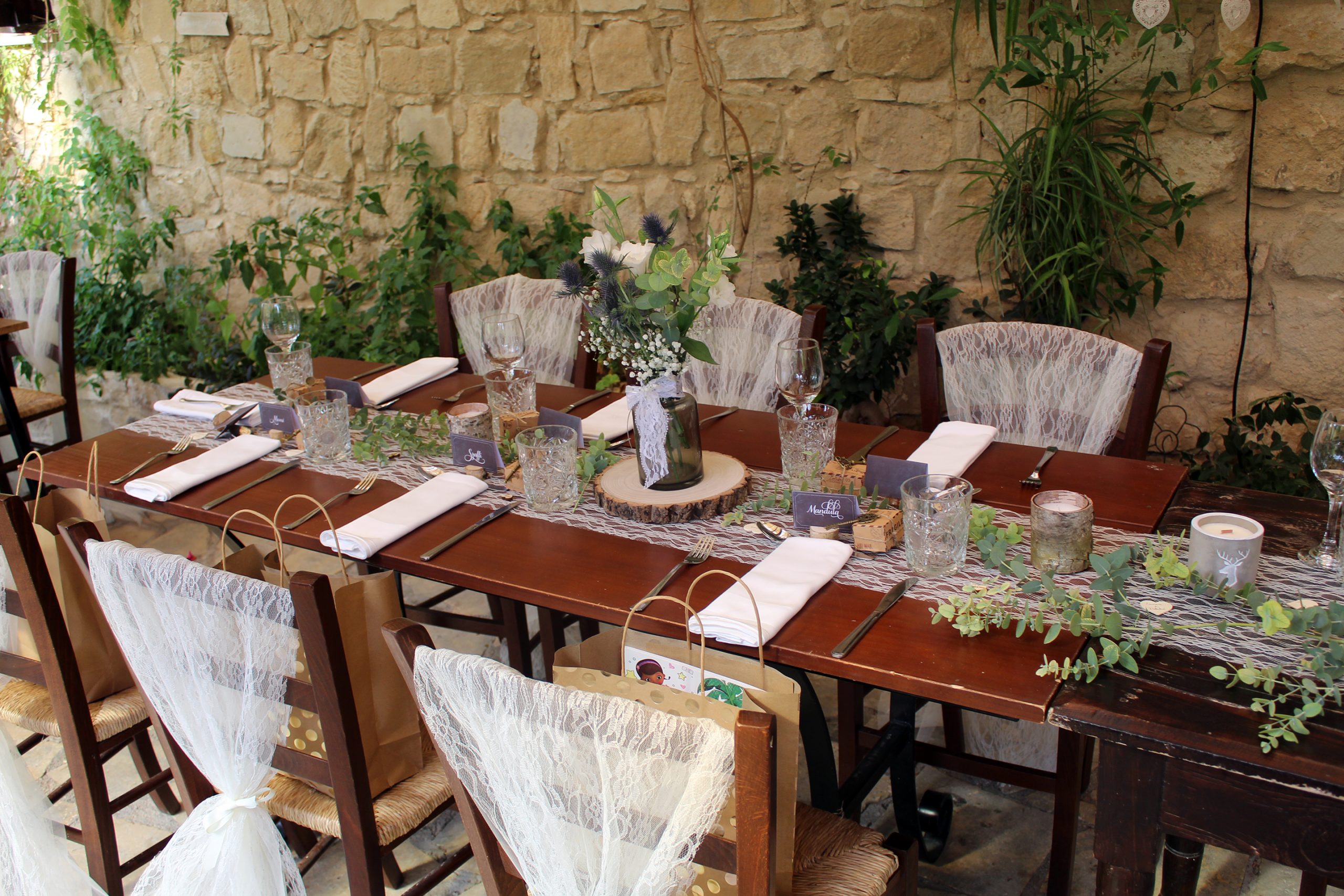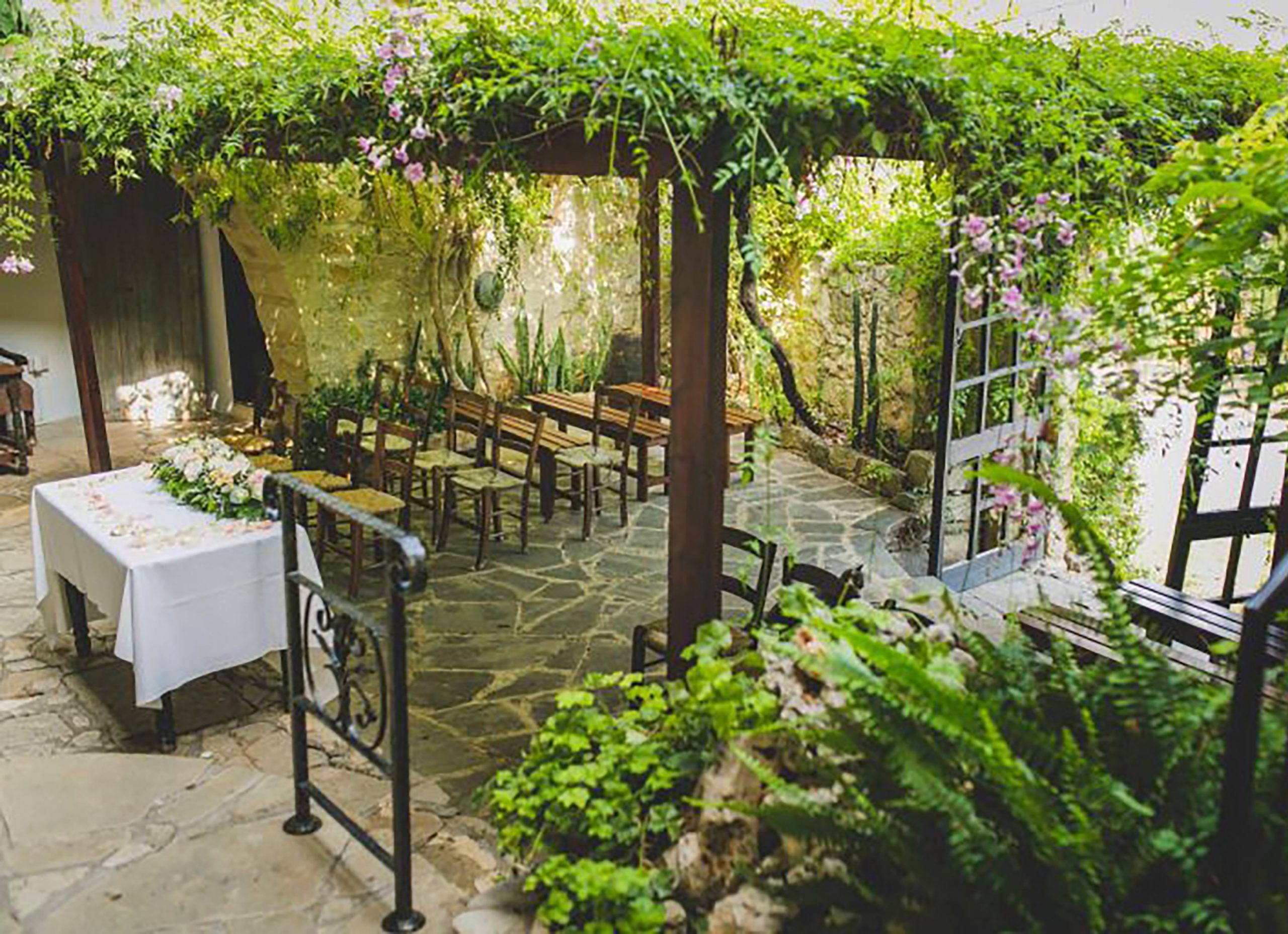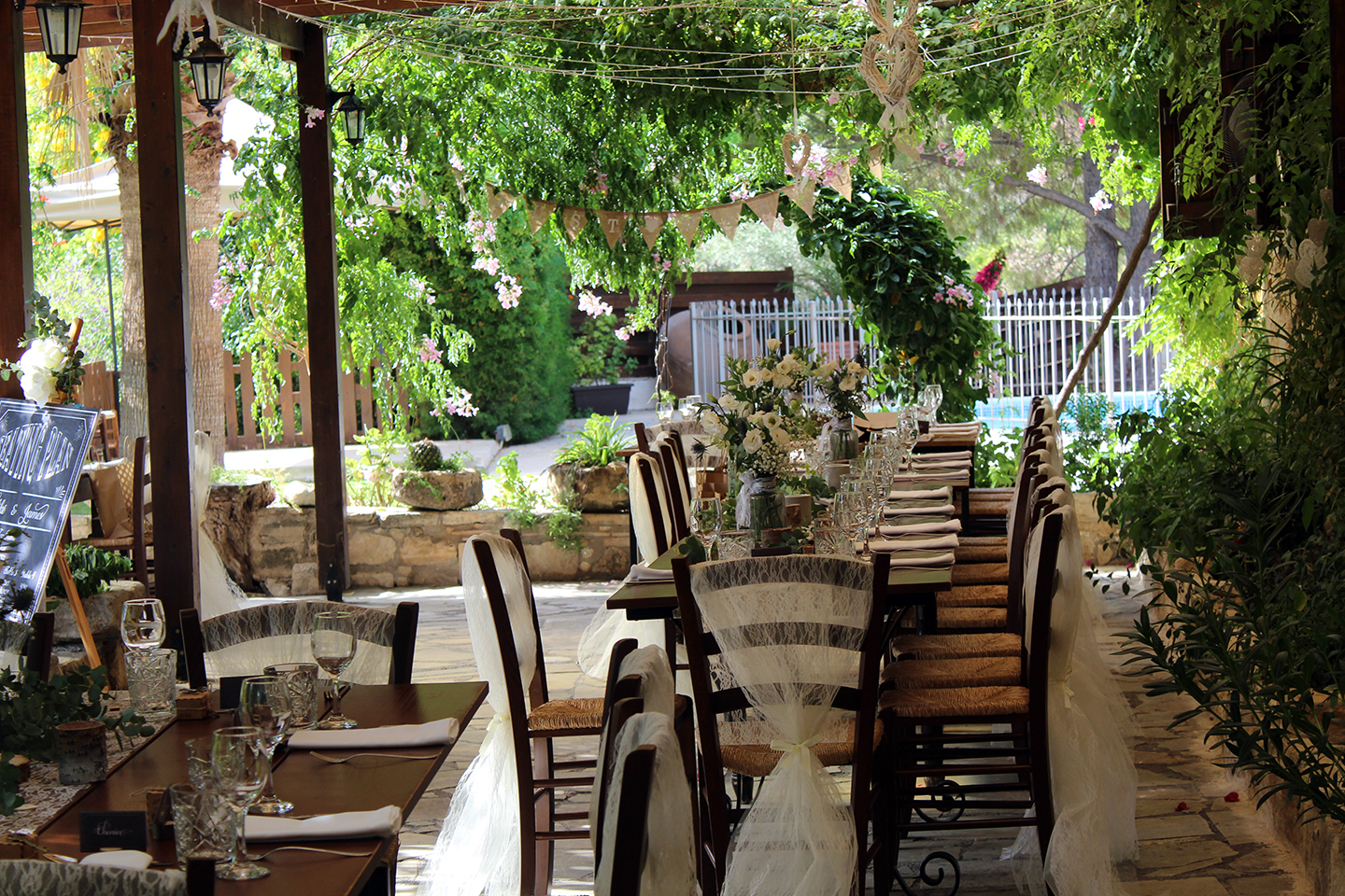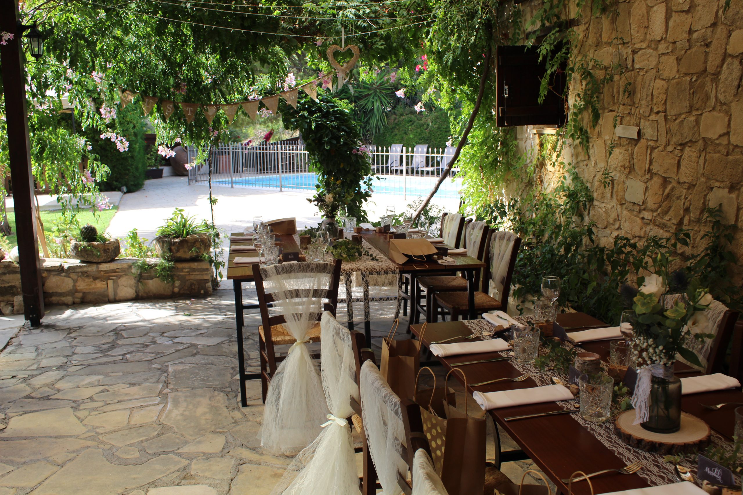 Vasilias Nikoklis Inn is a unique and beautiful traditional venue situated close to the village of Nikokleia, located in the picturesque valley of Diarizos  approximately 15 minutes drive from Paphos. This family owned inn is over a 100 years old, and was a traditional Khan or travellers rest. It has been tastefully renovated but still retains its historic and rustic charm.  The ground floor of the inn is now operated as an exclusive wedding venue which also offers 8 characterful bedrooms including a bridal suite. Surrounded by countryside. with a backdrop of the Troodos mountains this stunning rustic inn is a unique and totally private venue for both your wedding ceremony and reception meal. The gardens and olive groves of the inn enable the owners to make their own olive oil and grow vegetables which are used in their kitchen. Surrounded by lush greenery, with a rustic vine covered terrace it is a magical venue for your wedding day.